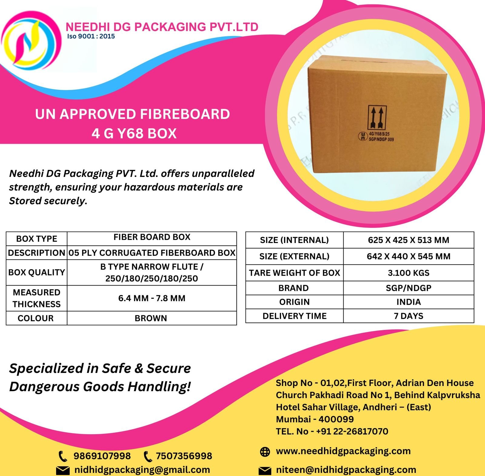 UN approved 4GY fiberboard box engineered for the safe transport of liquids and hazardous goods. Designed to meet international Y-rated packaging standards, ensuring exceptional protection and compliance.