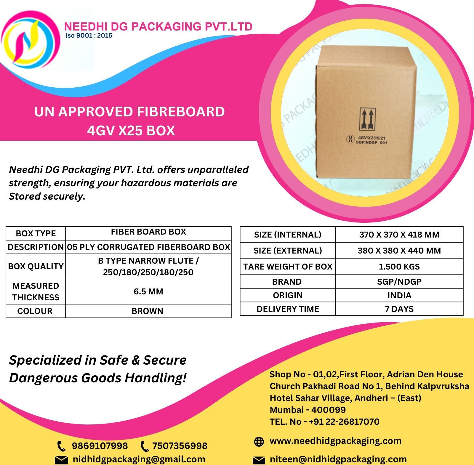 UN approved 4GV X25 fiberboard box designed for secure transportation of hazardous materials.