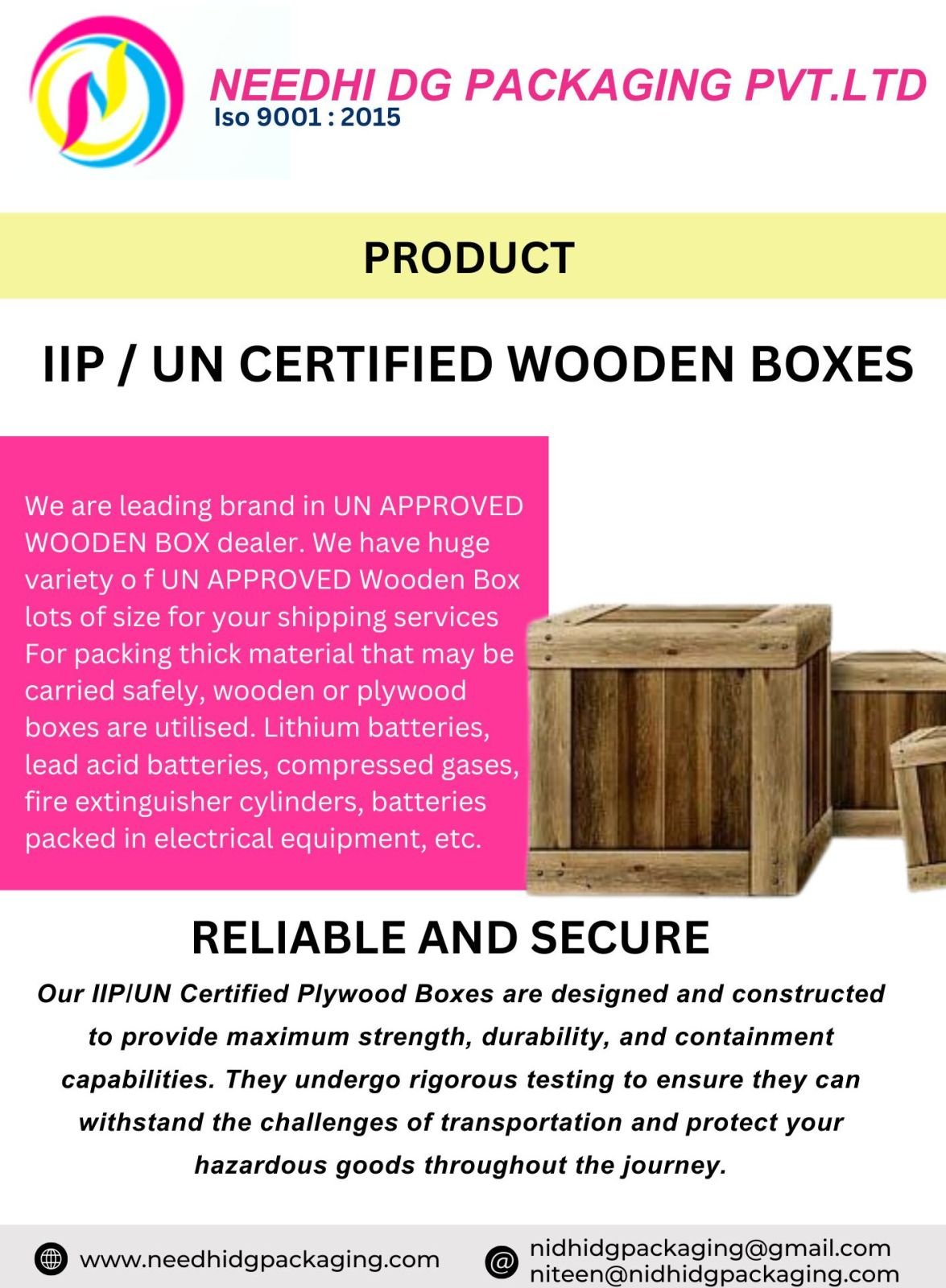 UN/IIP approved wooden box for safe storage and transportation of hazardous materials.